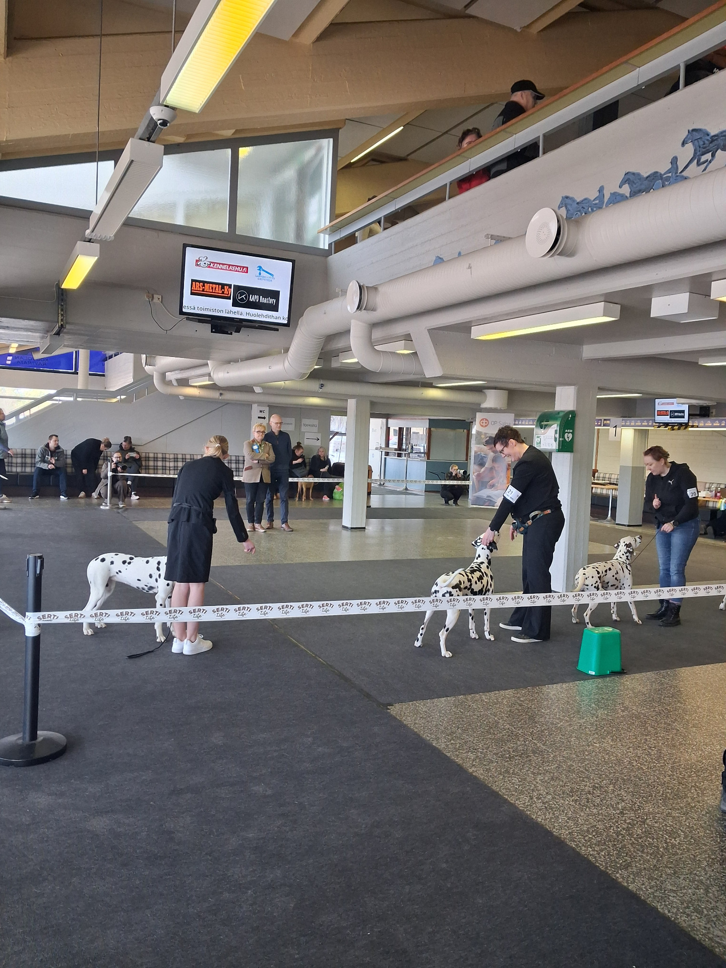 Kävimme Karangon Toffeen kanssa pyörähtää Kuopiossa uusien ulkomuototuomareiden loppukokeessa niin näkivät sen mettämiehen sertin koirankin. Toffeeta kiinnosta pätkääkään homma mutta tulipaha käytyä.